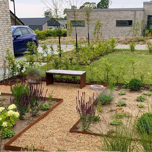 Benken er ennå ikke rustet på bildene. Dette skjer etter kort tid utendørs (vanligvis etter 2 måneder). Levetiden til 3 mm cortenstål er over 25 år.