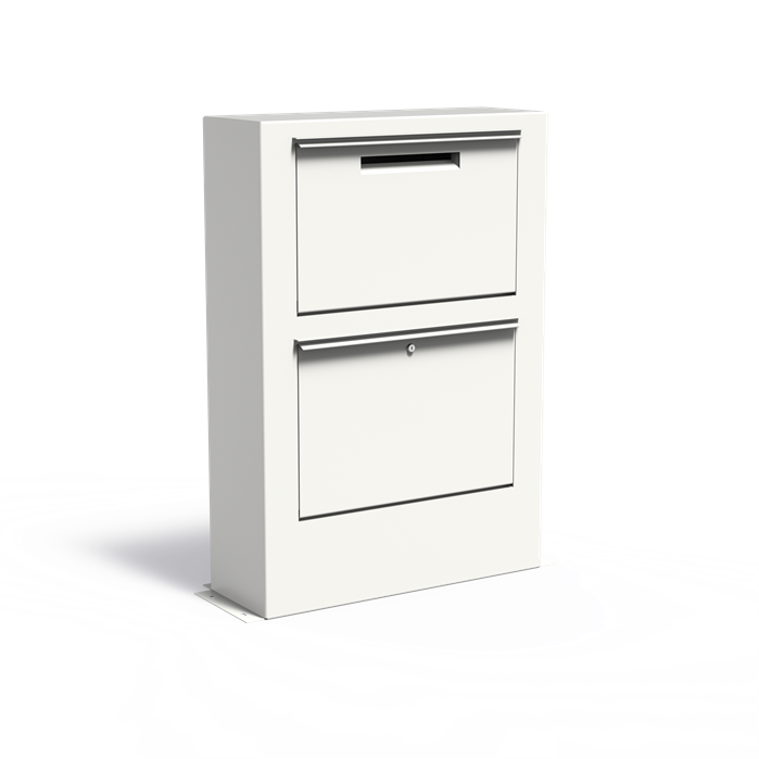 Postkassen har en enkel dør på forsiden som kan åpnes for å legge inn brev og pakker. Det er en låsbar dør i bunnen hvor posten og pakkene hentes ut. Postkassen er laget av hvitmalt matt stål RAL 9016. Hvis du ønsker det, er det mulig å bytte låsen til en annen modell. Den indre bunnen for pakker er laget av perforert plate, som sikrer at pakken aldri blir utsatt for vann eller fuktighet som kan samle seg. Det er en intern tyverisikring for posten.