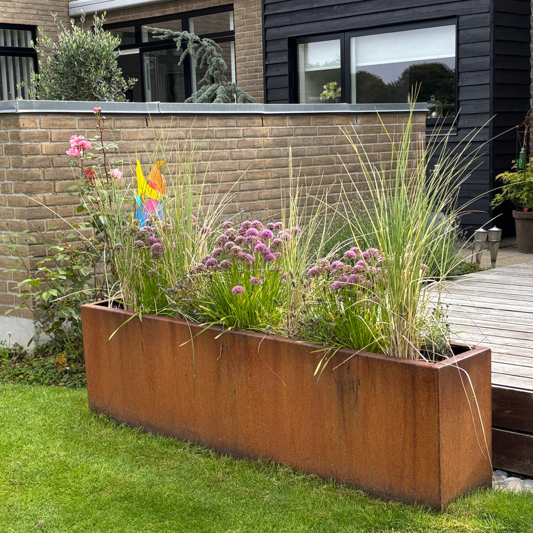 Vi produserer våre plantekasser fra bunnen av. Det betyr at vi skjærer cortenstålet til akkurat den størrelsen du ønsker. Se våre spesialtilpassede størrelser her.