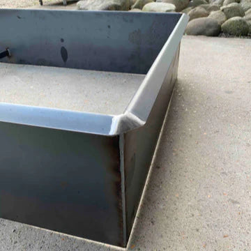 Alle plantekasser har helsveisede hjørner, noe som sikrer en robust og holdbar konstruksjon. Plantekassene våre er håndsveiset av våre dyktige smeder. Hvis du bestiller en plantekasse med bunn, blir bunnen aldri helsveiset for å sikre at vannet kan renne av. Vi borer også dreneringshull. Bildet viser et eksempel på en full sveising – sveisen blir vanskeligere å se når det hevede bedet ruster.